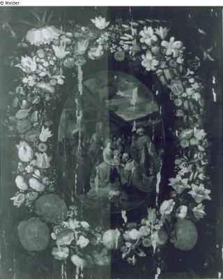 Mittig ein hochovales Bildfeld, umgeben von üppigen Blumenkranz.