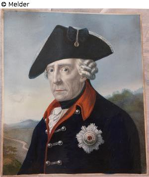 Oberkörper-Porträt des Königs Friedrich II. der Große im Alter mit Hut und in Uniform.