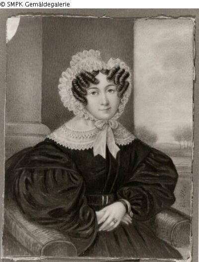 Bildnis einer Dame mit Spitzenhaube, sitzend im Sessel, rechts ein Landschaftsausblick