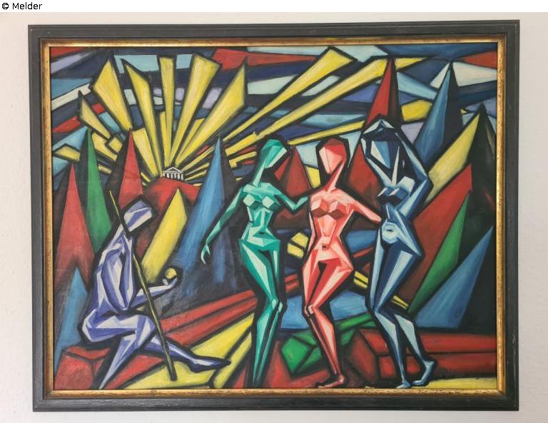 Kubistische Darstellung des Urteils des Paris. Paris sitzt im linken Bildvordergrund mit dem Apfel in der linken und einem Stock in der rechten Hand. Von der Bildmitte ausgehend ihm gegenüber die drei Göttinen. Im linken Bildhintergrund eine Tempel.