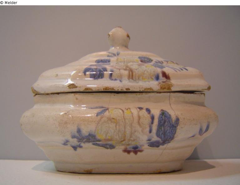 längsachteckige Deckeldose mit nach unten hin dreifach bauchig abgestufter Wandung und eingezogener Kehle. Senkrechter Standring, Boden leicht eingetieft und glasiert. In Kehlen gestufter und gerade endender Falzdeckel mit vierkantigem, leicht eingezogenem Knauf. Weiß glasierter, heller Scherben mit Scharffeuermalerei in Mangan, Grün, Gelb und Blau. Blaue Glasurverfärbungen durch verlaufene Malerei. Glasur z.T. ungleichmäßig und mit schwarzen Punkten. Farbe abgelaufen und Malerei verschwommen.