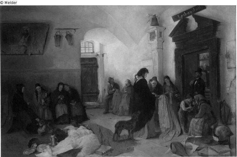 Rechts über der Tür die Inschrift: "Leihanstalt". - Vorraum zur Leihanstalt mit sitzenden alten Frauen und Männern. Rechts Eingang mit einem Herrn im Zylinder.