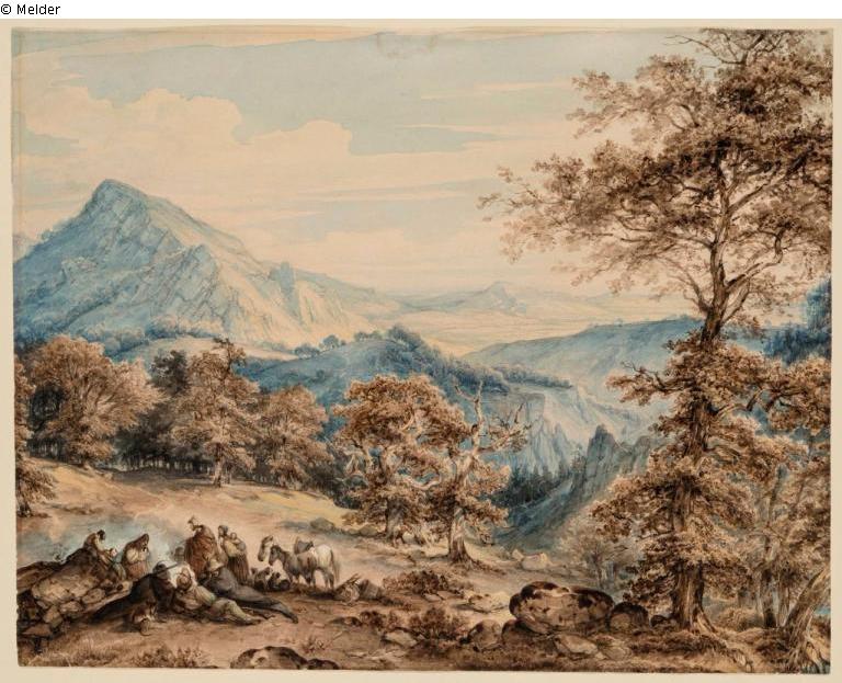 Deutsche Landschaft mit felsigen Bergen und weitem Blick, im Vordergrund stattliche Eichen und eine Gruppe Lagernde