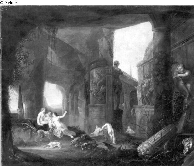 Fundmeldung | Einzelobjekt Diana mit Gespielinnen in einer Ruine Lost Art-ID220569 Vorherige Weiter Hersteller/Künstler:in Poelenburg, Cornelis van Geburt (um) 1586, Utrecht Tod 1667.08.12, Utrecht WirkungsortRom; Florenz; Utrecht TitelDiana mit Gespielinnen in einer Ruine Datierung1651ObjektartMalereiObjektgruppeMalereiMaterial / TechnikÖl ; Leinwand / gemalt Höhe 96,00 cm Breite 120,00 cm Inventarnummermü7694Beschreibung Signatur: C.Poelenburgh 1651; Links sitzend Diana, um sie zwei Mädchen, links von ihr Obelisk, vor ihr Hunde. An Ruinen stehen Plastiken (rechts ein Putto mit Schild). Im Mittelgrund 2 Mädchen, eine weitere rechts badend. Weiterlesen Weniger anzeigen Bestand Kulturgüter aus dem ehemaligen ReichsvermögenVeröffentlicht seit2001 Kontakt Kunstverwaltung des Bundes Herbert-Bayer-Straße 5 13086 Berlin Deutschland E-Mailprovenienzforschung@kvdb.bund.deHomepagehttp://www.kunstverwaltung.bund.de