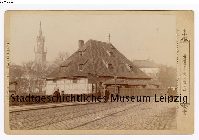 Sepia-Abzug auf Fotopapier auf Pappe, dargestellt ist die alte Nonnenmühle. Im Hintergrund steht die alte Propsteikirche. bez. u. r. (geprägt): Herm. Vogel / Leipzig.; Fotopapier: Ansicht der alten Nonnenmühle. bez. u. l. (geprägt): 1890; Pappe: bez. m. l. (Druck): Leipzig und Umgebung; bez. m. r. (Druck): Photographie und Verlag von Hermann Vogel in Leipzig. / Die alte Nonnenmühle.