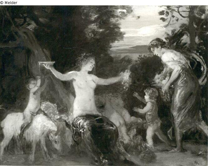 Fundmeldung | Einzelobjekt Die Erziehung des Bacchus (2 Bacchantinnen mit Putten und einem kleinen Satyr) Lost Art-ID218988 Vorherige Weiter Hersteller/Künstler:in Kaulbach, Friedrich August von Geburt 1850.06.02, München Tod 1920.07.26, Ohlstadt (Murnau) WirkungsortMünchen; Paris TitelDie Erziehung des Bacchus (2 Bacchantinnen mit Putten und einem kleinen Satyr)ObjektartMalereiObjektgruppeMalereiMaterial / TechnikÖl ; Leinwand / gemalt Höhe 64,00 cm Breite 83,00 cm Inventarnummermü11305Beschreibung Signatur: FAK;Eine Bacchantin sitzend mit ausgebreiteten Armen, in der linken Hand Trauben, in der rechten eine Schale. Zu dieser erhebt der auf einem Bock sitzende Satyr die Hände. Rechts herbeieilende zweite Bacchantin, vor ihr ein Putto. Weiterlesen Weniger anzeigen Bestand Kulturgüter aus dem ehemaligen ReichsvermögenVeröffentlicht seit2001 Kontakt Kunstverwaltung des Bundes Herbert-Bayer-Straße 5 13086 Berlin Deutschland E-Mailprovenienzforschung@kvdb.bund.deHomepagehttp://www.kunstverwaltung.bund.de