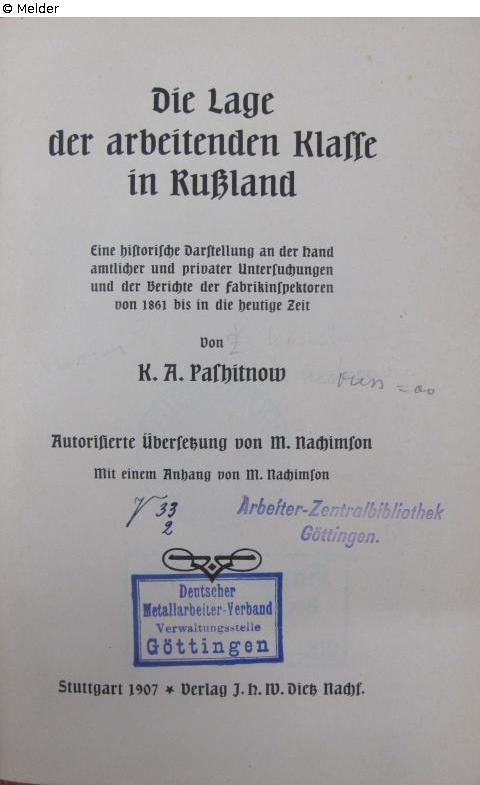 8°, auf Titelblatt sowie an mehreren anderen Stellen Stempel der Verwaltungsstelle Göttingen des Deutschen Metallarbeiterverbandes, auf Titelblatt Stempel der Arbeiter-Zentralbibliothek Göttingen, vorne im Deckel und auf Rückseite des Titelblattes Stempel des Hauptarchivs der NSDAP mit der Nummer 44/16787
