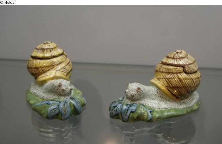 kriechende Schnecke auf ovalem, welligem Sockel, unter dem Schneckenkopf Blätter, Schneckenhaus als Dose, oberes Drittel abnehmbar, rechteckige Zacke zum Einpassen, heller Scherben, weiße Glasur, Inglasurmalerei in Braun, Gelb, Grün, Mangan