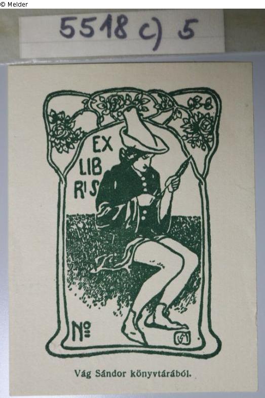 Inschrift "EX LIB RIS", unten: "No LM", ganz unten: "Vág Sándor könyvtárából." In Bleistift auf Rückseite notiert: "fecit Jasztróczy Mano"