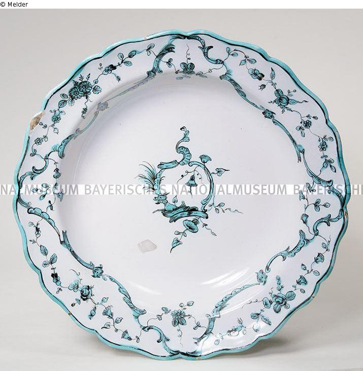 url: http://www.bayerisches-nationalmuseum.de/webgos/bnm_online.php?seite=5&fld_0=00075720; Befund: Tiefer Fayence-Teller mit grünem Rocaille-Dekor und Kartusche im Fond. Am Rand leicht bestossen. Auf der Unterseite in roter Farbe "42/211" (= BNM Inv.-Nr.)./A.G., 2016.02.28