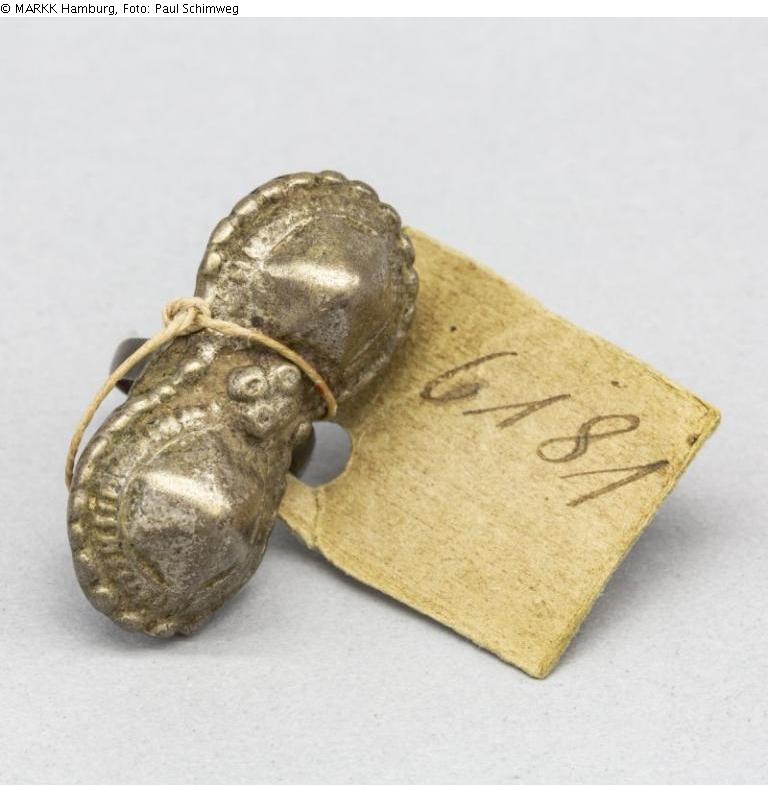 Fingerring mit länglicher Platte und Doppel-Kuppelverzierung, umfasst mit Granulierperlen. Fingerreif offen. Kuppeln in sechsseitiger Pyramidenform. Dazwischen Blume aus vier Perlen. Bodenplatte seitlich offen. Ring und Technik lässt auf Herkunft Rajasthan/Indien schließen.