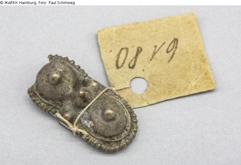 Längliche Platte eines Fingerrings mit Doppel-Kuppelverzierung, umfasst mit Granulierperlen. Fingerreif und Bodenplatte fehlen. Kuppeln mit Perlknopfabschluss. Mittig Blume aus fünf Perlen. Ring und Technik lässt auf Herkunft Rajasthan/Indien schließen.