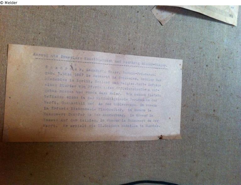 Fundmeldung | Einzelobjekt Hafen mit Schuten und Arbeitern Lost Art-ID533249 Vorherige Weiter Hersteller/Künstler:in Sandrock, Leonhard Geburt 1867.03.05 / 1867.06.05, Neumarkt (Schlesien) Tod 1945, Berlin WirkungsortBerlin TitelHafen mit Schuten und ArbeiternObjektartGemäldeObjektgruppeMalereiMaterial / TechnikÖl ; Leinwand / gemaltAbmessungenRahmen: 114 cm x 90 cm Höhe 96,00 cm Breite 72,00 cm Provenienz Erwerb kurz nach dem 2. Weltkrieg in St. Petersburg, vermutlich aus dem Bestand eines deutschen Museums Weiterlesen Weniger anzeigen Veröffentlicht seit10.05.2016 Kontakt Kontaktanfragen richten Sie bitte an das Deutsche Zentrum Kulturgutverluste.