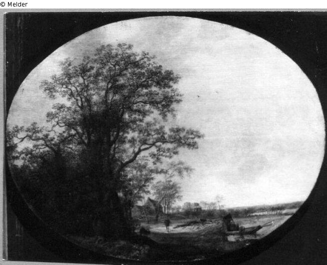Das Gemälde zeigt eine flache Landschaft. Im Vordergrund ist im linken Bildteil eine hohe Baumgruppe dargestellt, darunter ein Jäger. Im rechten Bildteil ist ein Ufer zu sehen, an dem ein Mann mit Boot steht. Im Hintergrund befinden sich Häuser sowie vereinzelt Bäume unter bewölktem Himmel. Brauntöne dominieren die Darstellung.