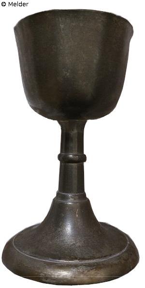 Schlichter Zinnpokal mit kelchförmigem Becher. Der Stiel ist mit einer Wulst verziert. Nach oben gewölbter Fuß mit einer kleinen Stufe zum Rand und einer leichten Doppelstufe zum Stiel vorhanden. Keine Marken vorhanden. Der Rand des Kelches ist verbogen. Der Fuß am Rand ist eingedrückt. Reparatur-Schleifstellen am Übergang von Kelch und Stiel.