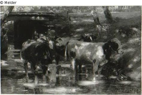 Drei buntscheckige Kühe im Wasser der Tränke stehend. In Richtung des Betrachters blickend, die linke Kuh trinkend, dazwischen der Hirte mit Hut und Gerte in der Hand, ebenfalls im Wasser stehend. Am abschüssigen Ufer rechts zwei Baumstämme. Im Hintergrund eine Brücke, links an der Brücke ein Stück eines Baumstammes. Durchscheinende Sonnenflecken auf dem Wasser und am Ufer.