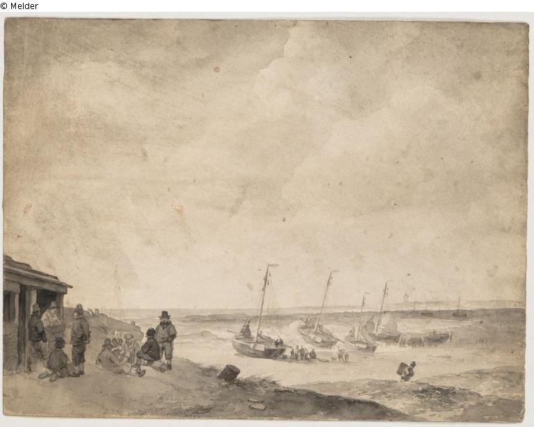 Strand mit Fischerbooten; mehrere Personen an einem Unterstand am Dünenrand; links Hütte