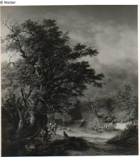 Hoher Baum links, davor Bach. An einem Baum Bauernmädchen sitzend mit bloßen Füßen. Sitzender und stehender Hirte auf einen Hund schauend. Rechts vom Wege Bäuerin vor einer Kate. Schafe auf dem Wege.