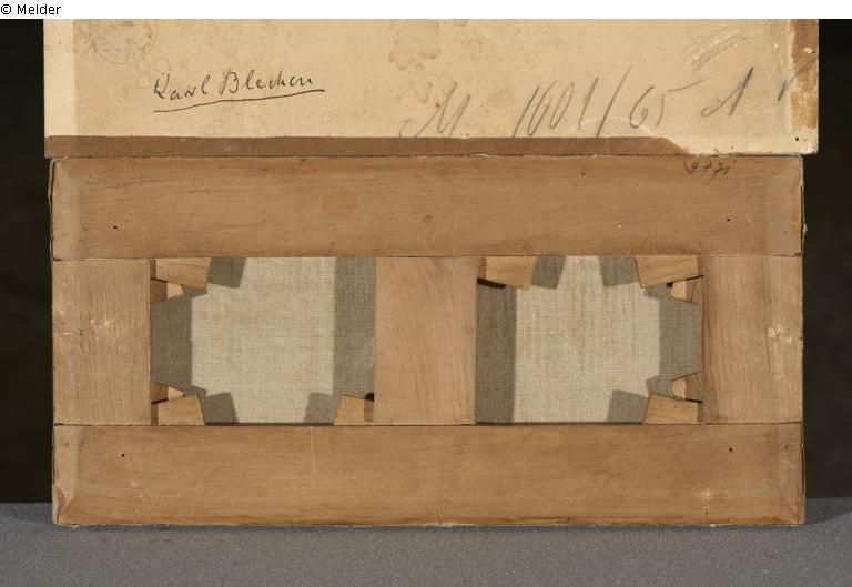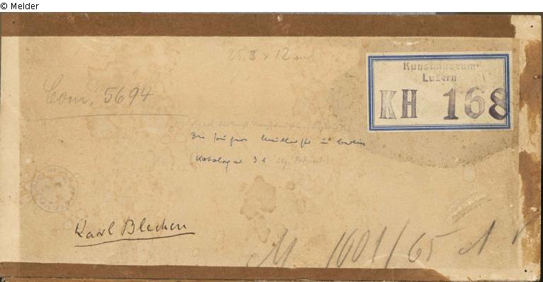 Leinwand und Keilrahmen neu. Keilrahmen: Verso: o.r. in Blei: "9871". Rückseitenschutz: o.l. in Blei: "Com. 5694"; o.M. in Blei: "25,3 x 12 cm"; o.r. Etikett: "Kunstmuseum / Luzern / KH 168"; M. in Blei: "(laut Auskunft Kunstmuseum Luzern)"; M. in blauem Kuli: "Die frühere Müllerstr. in Berlin / Katalognr. 31"; M. in Blei: "Slg. Freund)"; u.l. Stempel: unleserlich; u.l. in schwarzer Tinte: "Karl Blechen"; u.M. in Blei: "M 1001/65 1"