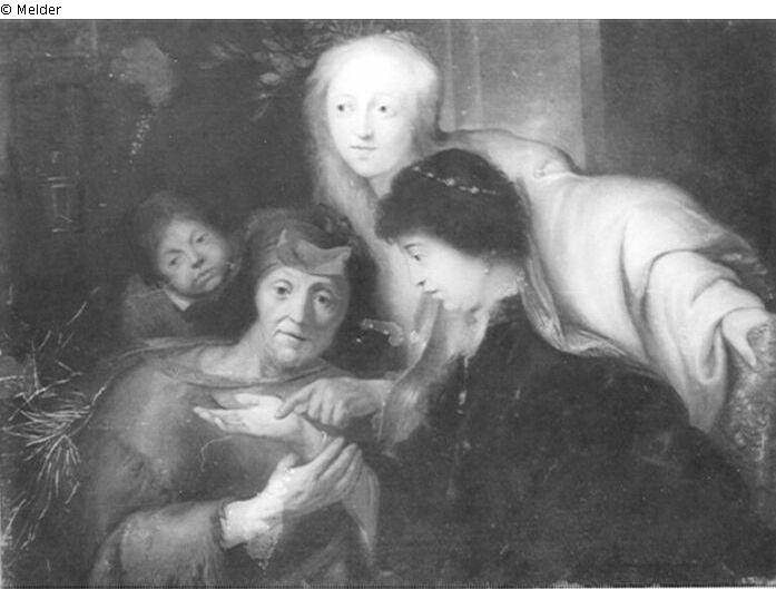 Im Mittelpunkt ein junges Mädchen, die Rechte der Wahrsagerin hinhaltend. Die Wahrsagerin den Blick verinnerlicht ins Leere gerichtet, ein Kind und weiteres Mädchen wohnen der Sagung bei.