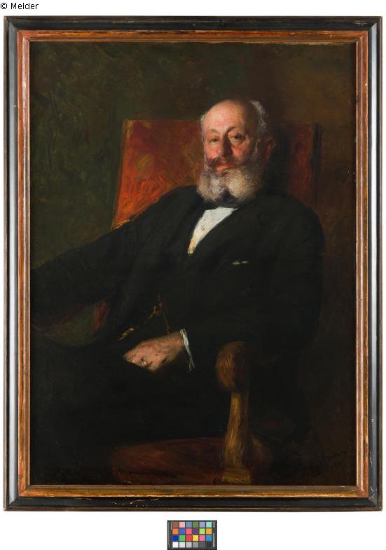"Max Nordau, sitzend mit weißem Bart auf einem kardinalsrot tapeziertem Armstuhl. Halbe Figur, en face, den linken Arm auf der Stuhllehne aufgestützt u. die Hand im Schoß liegend. Ein typisch impressionistisches Gemälde." (Berger-Inventar); Zierrahmen; signiert rechts unten: "J. Epstein 1901";