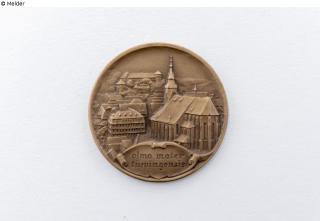 Medaille "alma mater/tüwingensis" zur 450 Jahrfeier der Eberhard-Karls-Universität Tübingen mit Ansicht der Stiftskirche, der Alten Aula, der Burgsteige und dem Schloss Hohentübingen von Südwesten