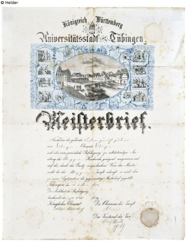 Meisterbrief von Metzger Christian Heinrich Härtner mit Ansicht von Tübingen mit der Neckarbrücke