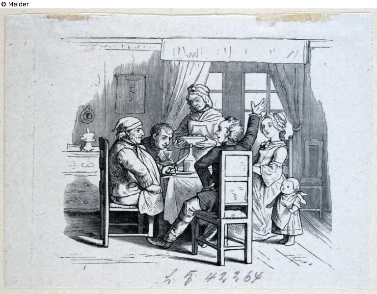 Mittagstisch zu fünft, das Töchterchen zuhörend