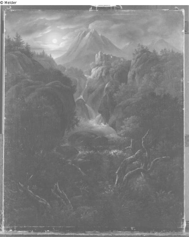 Rechts oben strahlt der Vollmond am violettgraubewölkten Himmel auf ferne Felsberge und eine Burgruine im Mittelgrund auf bräunlichem Felsen, beiderseits, von dem Wasserfällen in die Klamm stürzen, wo über kleinen Wehr ein stiller grüner Wasserspiegel erscheint. Die bewachsenen Steilhänge verbindet vorne Uferwildnis mit Strünken, zwischen denen ein Hirsch ruht.