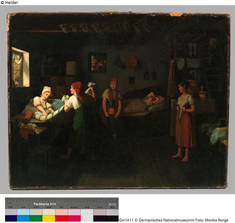 Inneres einer donauländischen Bauernstube, in die seitlich links durch ein verhängtes Fenster das Morgenlicht fällt. Davor liegt ein Mädchen im Bett, dem eine bereits angekleidete Magd das Bettuch wegzieht. An der Rückwand der Stube schläft ein Mädchen noch; auf ihrem Bettrand zieht sich ein Mädchen die Strümpfe an. Darüber ein kleines Fenster, durch das zwei Bauernburschen in die Stube blicken. Rechts neben dem Ofen, der mit Gerät und Kleiderstücken behängt ist, ein weiteres Bett, davor steht barfüßig ein Mädchen, das ihren roten Miederrock schließt und zu der Fenstergruppe herübersieht. Signatur: "Neder pinx 1830".