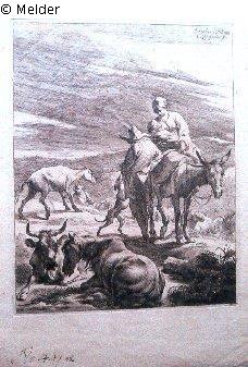 Mutter mit Kind auf einem Esel (Hirtenfamilie mit Herde in Gewitterlandschaft)