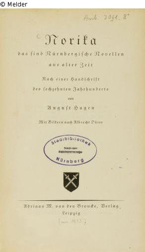 Fundmeldung | Einzelobjekt Norika, das sind Nürnbergische Novellen aus alter Zeit. Nach einer Handschrift des sechzehnten Jahrhunderts Lost Art-ID482152 Vorherige Weiter Autor:in Hagen, August TitelNorika, das sind Nürnbergische Novellen aus alter Zeit. Nach einer Handschrift des sechzehnten JahrhundertsErscheinungsortLeipzig Erscheinungsdatum1913ObjektartBuchObjektgruppeBibliotheksgutSignaturAmb. 3091.8°Provenienz Ankauf OFP Nürnberg 1944. Aus der Bibliothek Eugen und Paula Kirschbaum, Nürnberg und Utting am Ammersee. Weiterlesen Weniger anzeigen Veröffentlicht seit18.02.2014 Kontakt Stadtbibliothek im Bildungscampus Nürnberg Gewerbemuseumsplatz 4 90403 Nürnberg Deutschland Postfach Postfach 90317 Nürnberg Deutschland Tel+49 (0) 911 231 7565Fax+49 (0) 911 231 5476Homepagehttp://www.stadtbibliothek.nuernberg.de Ansprechpartner:in Dr. Christine SauerPositionLeiterin der Historisch-Wissenschaftlichen StadtbibliothekTel+49 (0) 911 231 2832E-MailChristine.Sauer@stadt.nuernberg.de Ansprechpartner:in Dr. Dominik Radlmaier PositionStadtarchiv Nürnberg / ProvenienzforschungTel+49 (0) 911 231 27 70 Ansprechpartner:in Leibl RosenbergPositionSachgebiet Handschriften und Alte Drucke der Sammlung IKGTel+49 (0) 911 231 2721E-MailLeibl.Rosenberg@stadt.nuernberg.de