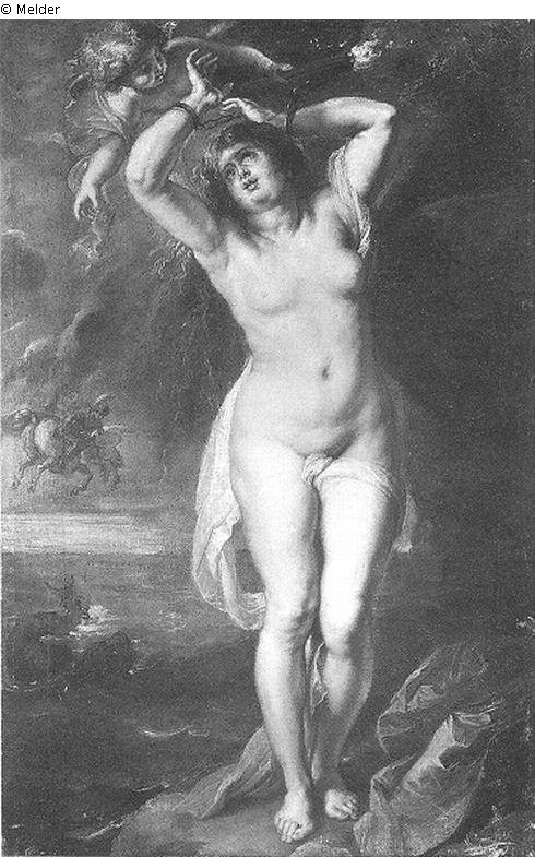 Befund der Rückseite: Auf der Leinwand, links oben: runder Zollstempel dunkel, unlesbar; unten, links: runder Zollstempel in Rot, wohl mit zentralem figürlichem Motiv, aber unlesbar; darunter runder Zollstempel, dunkel, unlesbar. - Auf dem Keilrahmen, obere Leiste: handschriftlich mit blauem Stift: >5489< (CCP München, Münchner Nr.); mit weißer Kreide: >IX.2 [?].39<; mit weißer Kreide: >G 913<, oval eingefasst (Transportnummer für das Amerikanische Inventar); mit Bleistift: >1821 [?] / 116<; rechte Leiste, oben: alter, stark zerstörter und vergilbter, querformatiger achtekkiger Klebezettel mit blauer Randbordüre, darauf handschriftlich mit Tinte: >..Mo...ollfus / ...o. 61 / .... / ...<; darunter ein weiterer alter rechteckiger Klebezettel mit doppelter Randeinfassung, stark zerstört und keine Schrift mehr vorhanden; untere Leiste, Mitte: quadratischer, perforierter Klebezettel mit blauem Aufdruck (Kreis und Ecksegmente) ohne Schrift; links: roter Zollstempel, nicht lesbar; linke Leiste: Inventaraufkleber der BSTGS; handschriftlich mit blauem Stift: >2280<; mit blauem Stift: >G-913< (Transportnummer für das Amerikanische Inventar); Aufkleber mit perforiertem Rand und blauer Rahmenbordüre, darauf handschriftlich: >Andromeda/am Felsen/v. van Dyck<; obere horizontale Mittelstrebe: dunkler runder Zollstempel (Durchmesser 2 cm): >DOUANE CENTRALE EXPORTATION / PARIS<; rechts handschriftlich mit weißer Kreide: >14<. - Auf dem Zierrahmen, obere Leiste rechts: Reste einer Aufschrift mit blauem Stift, unlesbar; rechte Leiste: oben handschriftlich mit blauem Stift: >5489< (CCP München, Münchner Nr.); mit weißer Kreide: >14<; untere Leiste, in der Mitte: quadratischer, perforierter Klebezettel mit blauem Aufdruck (Kreis und Ecksegmente) ohne Schrift; linke Leiste: handschriftlich mit blauem Stift: >6538< (durchgestrichen); oben: alter rechteckiger Aufkleber mit perforiertem Rand und blauer Rahmenbordüre, darauf handschriftlich mit Tinte: >s. Katalog /Lamers (oder: Lamiere?)/ 1819.45 / Dollfusssamlg.<; handschriftlich mit rotem Stift: >v. Dyck/Andromeda<.