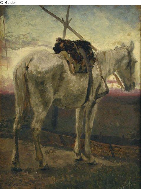 Pferdestudie (gesattelter Schimmel)