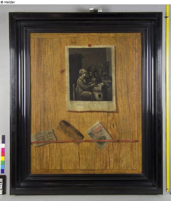 Das Trompe-l’œil zeigt eine gemalte Holztafel, auf der verschiedene Objekte durch geschickte perspektivische Darstellung die Illusion von wirklichen, am Holz befestigten Gegenständen erzeugen sollen. Oben im Bild ist eine Druckgrafik zu sehen, die spiegelverkehrt das Gemälde „Der Zechpreller“ (v. Adriaen van Ostade, Kreis) wiedergibt.