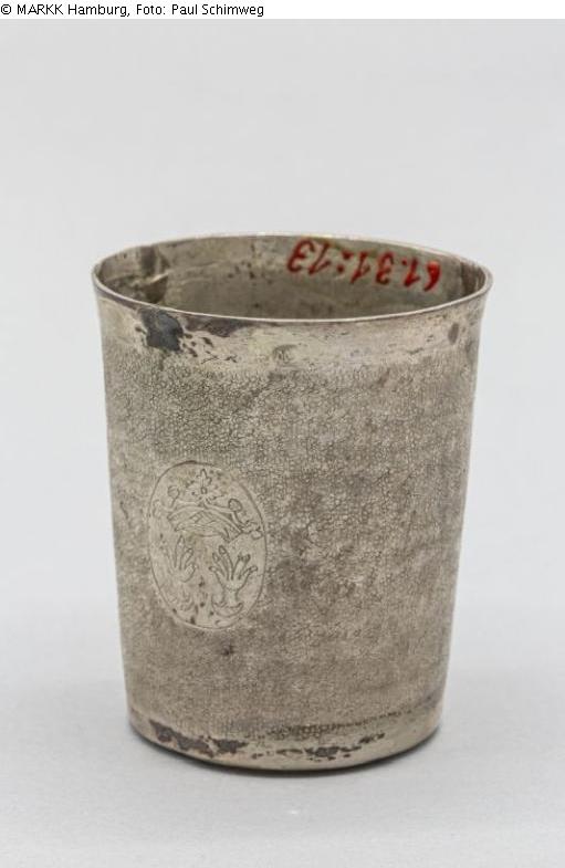 Schlangenhautbecher, zylindrische Form, Rand leicht ausgewölbt. Rand und Sockel glatt. Im Boden ist ein Taler eingelötet (s.o.). Das Medaillon, ein in der Außenfläche ausgespartes Oval, wurde offenbar nachträglich gefüllt: Unter einer ziselierten Krone sind zwei Hände eingraviert, die dem jüdisch-religiösen Symbol der segnenden Priesterhände entsprechen. Dies verweist auf Kohanim, möglicherweise auch in der Nutzung.