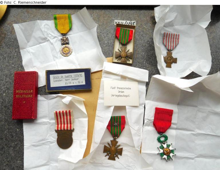 1. L’ordre national de la Légion d’honneur (Orden der Ehrenlegion), gestiftet erstmals von Napoleon am 19.05.1802. Emailliertes Metall an rotem Stoffband. Fünfstrahliger weißer Stern mit goldenem Rand auf einem Kranz aus grünen Blättern, zentral eine rundes Medaillon. Darin auf goldenem Grund als Relief antikisierendes seitliches Kopfstück einer Frau (Marianne?) mit Lorbeerkranz als Sinnbild der französischen Republik. Auf blauem Rand um das Kopfrelief in goldener Kapitalis: REPUBLIQUE FRANCAISE 1870.