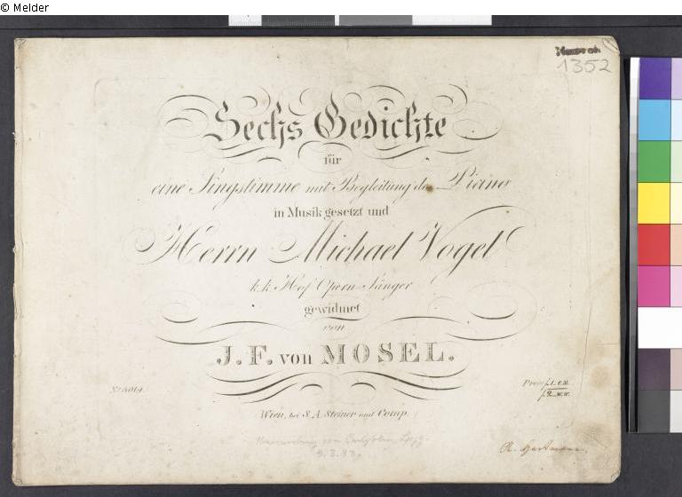 Sechs Gedichte (3 Goethe, 1 Schiller, 1 Grillparzer) für eine Singstimme m. Begleitung des Pianos. In Musik gesetzt u. Herrn Michael Vogel gewidmet. Wien S. A. Steiner (3014).