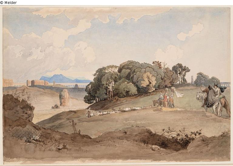 Serpentara, italienische Landschaft mit heimziehender Herde, Wäscherinnen und berittenen Hirten