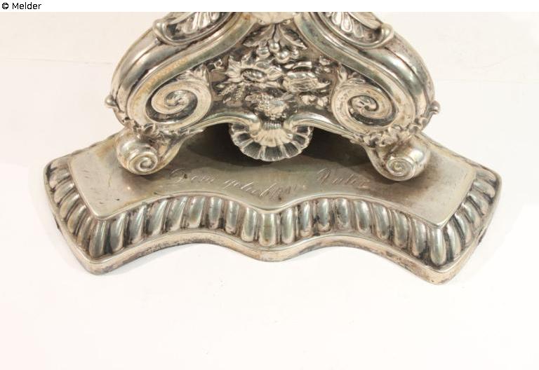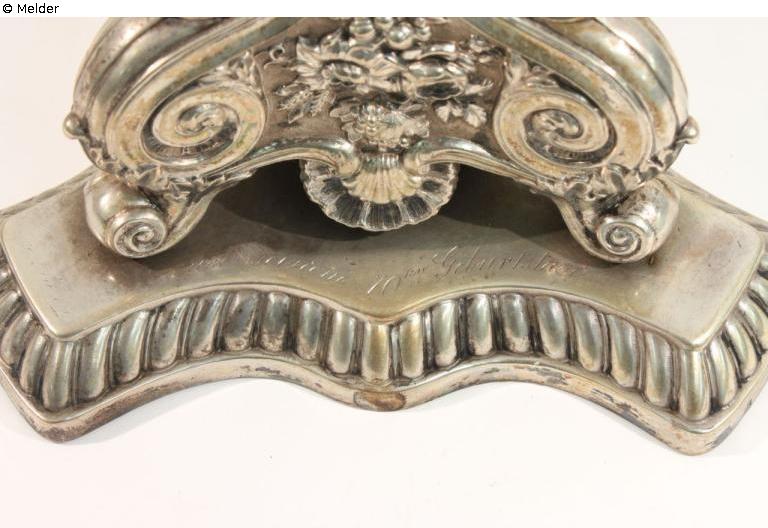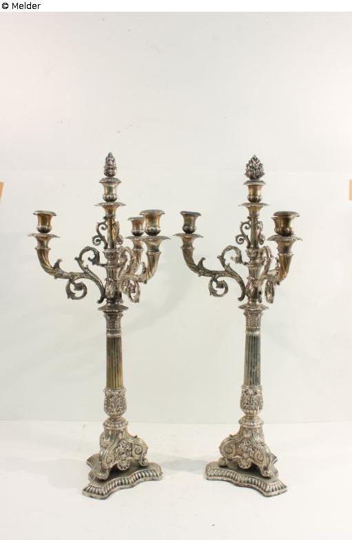 Die beiden großen, dreiflammigen Girandolen besitzen jeweils dreipassige, floral reliefierte Volutensockel auf drei Füßen, die auf Silber-Plinthen stehen. Der auf den Sockel aufgesetzte Schaft zeigt eine schlanke Balusterform mit Reliefdekor. Der Leuchteraufsatz ist mit Akanthusblättern und Ranken geschmückt. Er wird zentral von einer runden Traufschale mit aufsitzender, kratervasenförmiger Tülle samt flammenartigem Aufsatz bekrönt. Die nach drei Seiten ausschwingenden Leuchterarme tragen ebenfalls runde Traufschalen mit kratervasenförmigen Tüllen. Gravur: "Dem geliebten Vater an seinem 70ten Geburtstage, seine Kinder" sowie "In deines Lebens Abend leuchte hell; des Höchsten Gnade; zu der Deinen Liebe".
