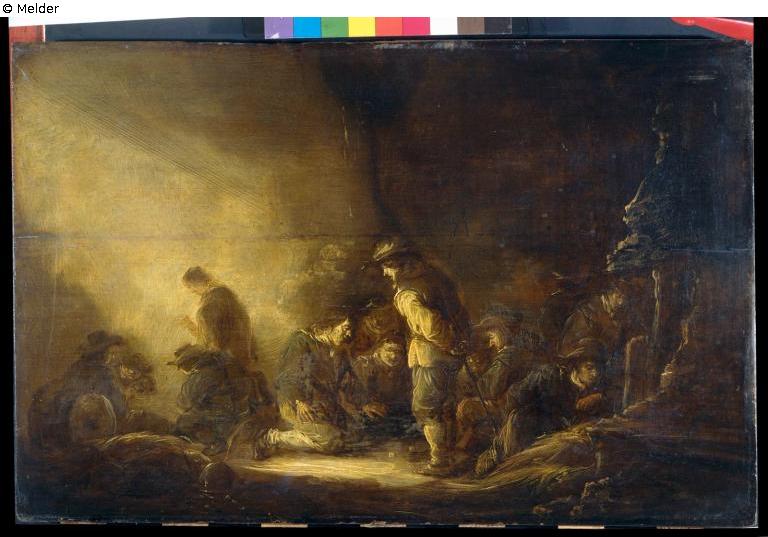 Die sechs Landsknechte der Hauptgruppe in der Mitte des Bildes, von denen einer ein wenig nach vorn gebeugt steht, während die anderen knien oder sitzen, sehen mit gespannter Aufmerksamkeit auf die beiden am Boden liegenden Würfel. Die Figur des stehenden Soldaten fängt das Licht auf, das von links hereinflutet. Auf der linken Seite eine weitere Gruppe von vier Soldaten mit einer Trommel, von denen wieder einer als Standfigur gegeben ist und ganz von dem einfallenden Licht umfangen wird. Auf der rechten Seite ragt ein Fels ins Bild, davor ist ein Bündel Stroh aufgeschüttet, an das sich ein Landsknecht lehnt. Hinter diesem werden noch zwei weitere Figuren sichtbar. Links im Vordergrund liegen Teile einer Rüstung und ein Helm am Boden. Der Ort der Handlung könnte als Höhle gedeutet werden, eigentlich findet nur durch eine solche Lokalisierung die Lichtführung ihre Begründung.