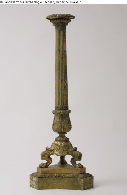 2 Stück; Die beiden gußgleichen Leuchter besitzen einen kannelierten Schaft, der auf einem dreifüßigen Sockel ruht. Dieser wird oben durch eine vierarmige Krone abgeschlossen, die ursprünglich Leuchtköper aufnehmen konnte. Die Einzelteile mit Blattwerkdekor sind z.T. verbogen und gebrochen