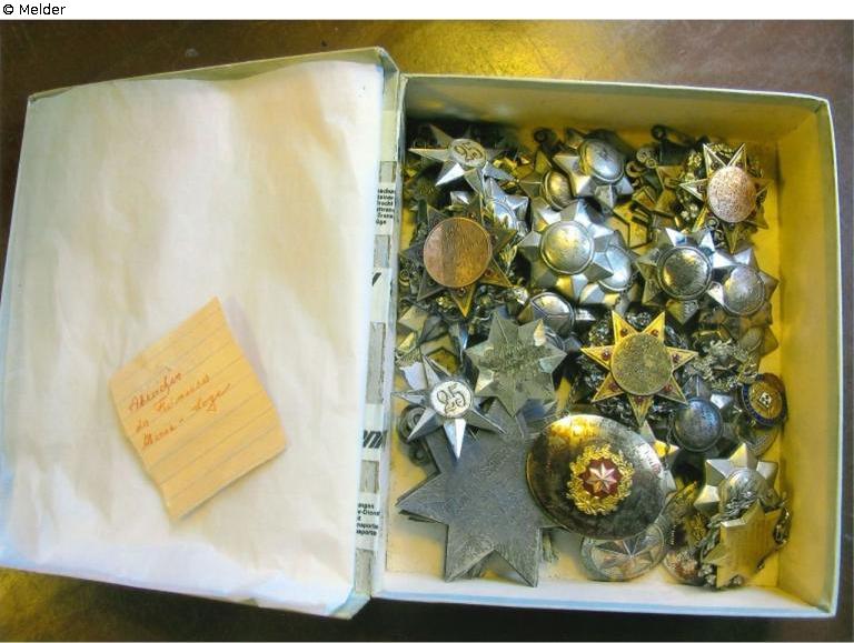 Bei den 105 Logenabzeichen handelt es sich um Bijous von verstorbenen Mitgliedern der Hamburger Hansa Loge. Die siebenzackigen Sterne und ovalen Orden sind überwiegend aus Silber oder Messing gefertigt und zeigen die eingravierten Namen ihrer einstigen Besitzer sowie weitere Inschriften.