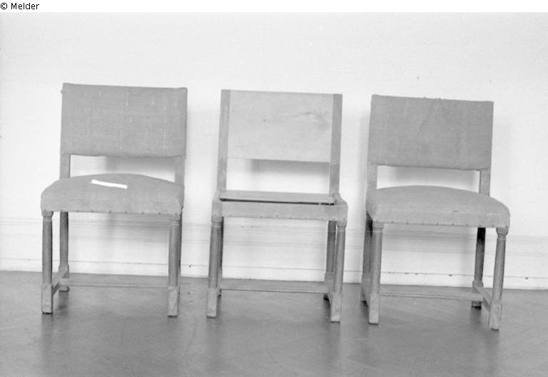 Brettlehne zwischen glatten Pfosten. Brettsitz in glatten Leisten. Säulenbeine auf hohen Sockeln. Zwischen glatten Seitenstegen ein profilierter Quersteg.