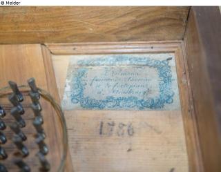 Stoßmechanik, F1 bis f3, zweichörig, rechtsstimmig. Kein Notenpult. Gestell mit vier gedrehten, kannelierten Spitzfüßen, in Fußklötze und den Unterboden eingedreht. Zwei Kniehebel. Oberfläche mattiert.