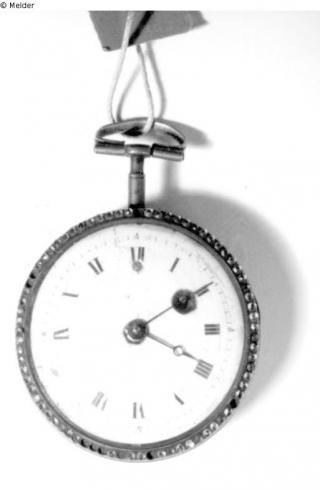 Vergoldete Spindeltaschenuhr mit Schlüsselaufzug an der Front. Weißes Emailleziffernblatt mit römischen Ziffern; Minuterie in arabischen Ziffern in Fünferschritten. Auf der Rückseite des gravierten Uhrengehäuses Darstellung einer sitzenden Frau im Profil nach links. Auf der Werksplatine Regulierscheibe mit AR und Signatur "Le Roy à Paris". Paris