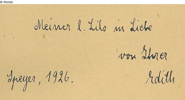 NS-Raubgut 1.) Geschenk der Stadt Speyer an die Saarpfälzische Landesbibliothek 1941 im Zuge der Deportation der saarpfälzischen Juden am 22.10.1940 nach Gurs (Frankreich) 2.) Widmung "Meiner l. Lilo in Liebe von Ihrer Edith. Speyer, 1926.": Edith Sussmanowitz an Weil, Liselotte, geb. 21.12.1908 Speyer; 1939 Emigration in die USA; gest. 19.4.2004; Schwester von Kurt Weil - restituiert im Oktober 2015