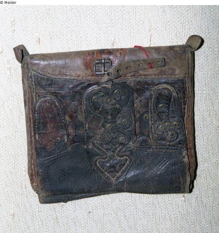 Die Umschlagtasche aus braunem Leder mit 4 Fächern ist traditionell gefertigt. Der Außenumschlag in Zungenform überlappt die Tasche zu drei Viertel und ist teilweise im Kreuzmuster punziert. Unterschiedliche Applikationen auf den Zungen, zuweilen mit Messingösen verziert. Die rechte Zunge ist beschädigt.