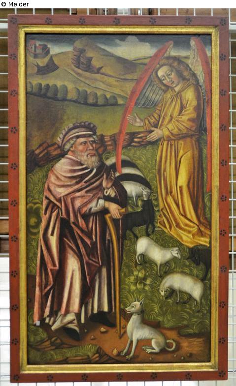 In einer begrünten Hügellandschaft steht links der bärtige Hl. Joachim in blassroter Hirtenkleidung, zu seinen Füßen ein Hund und neun schwarzen bzw. weißen Schafe. Von rechts oben erscheint ein rot geflügelter Engel in gelbem Gewand, die Geburt Mariens verkündend.