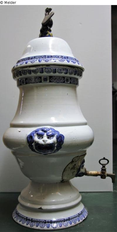 Am Rand des Deckels, des Fußes und des Gefäßes je ein Band von verschiedenen blauen Ornamenten; die Handhaben und der Ausguss, aus dem ein Messinghahn herauskommt, bilden blaue Löwenköpfe. Auf dem Deckel plastisch geformter schwarzer Adler mit gelben Beinen und Schnabel, der auf einer blauen Kugel sitzt. In der Mitte des Gefäßes und auf dem Deckel je einmal die verschlungenen Initialen FW (Friedrich Wilhelm)